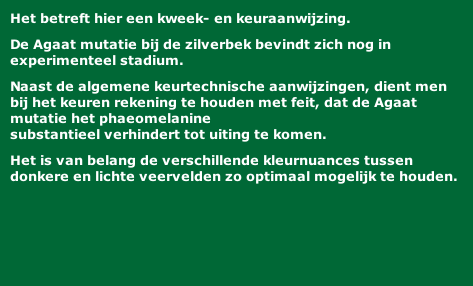 De overgang van de zo donker mogelijke koud zwartbruine vleugelbocht naar het crémebeige rugdek dient regelmatig en strak te verlopen. |