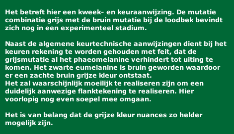 Bij de combinatie bruin met grijs wordt het bruine eumelanine niet of nauwelijks gereduceerd. Het laatste restje pheaomelanine wordt door de grijs mutatie gereduceerd waardoor deze bruin grijze kleur ontstaat. De vleugel balk en bovenstaart dekveren zijn mat bruin grijs is. De voorkeur gaat uit naar een vleugelbalk die gelijk van kleur diepte is als de staart. Voor alsnog dient er enige clementie voor het aanwezig zijn van de flanktekening maar dient wel opgemerkt te worden tijdens de keuring. De snavel dient bruin grijs te zijn en op de snijranden en aan de punt van de snavel donkerder van kleur. Hierdoor ontstaat een driehoekige vorm op de snijrand van de bovensnavel. |