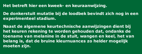 De overgang van zwartbruine vleugelbocht naar het donkerbruine rugdek dient regelmatig en strak te verlopen. |